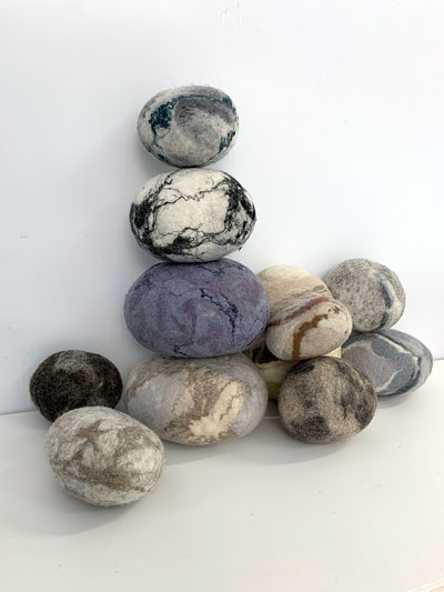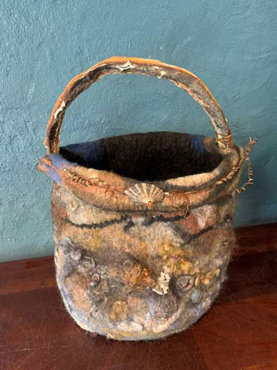 I am a felt artist, using the process of wet felting to create art in functional items that highlight the textures and colours of nature. This process of making the world's oldest form of fabric, while labour intensive, is both meditative and joyful for me as I explore its possibilities and limits in two and three dimensions. My primary focus is on household items such as bowls and baskets, table mats, vases, lightshades, and "rock" cushions. With purses, totes and pouches, art is carried outside of the home.